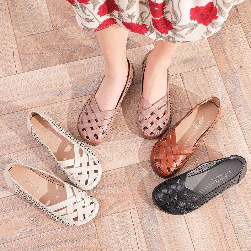 柔らかい革のママシューズ、夏のレディースサンダル、快適で滑りにくいシングルシューズ、中高年向けのフラットソールの下駄、女性用