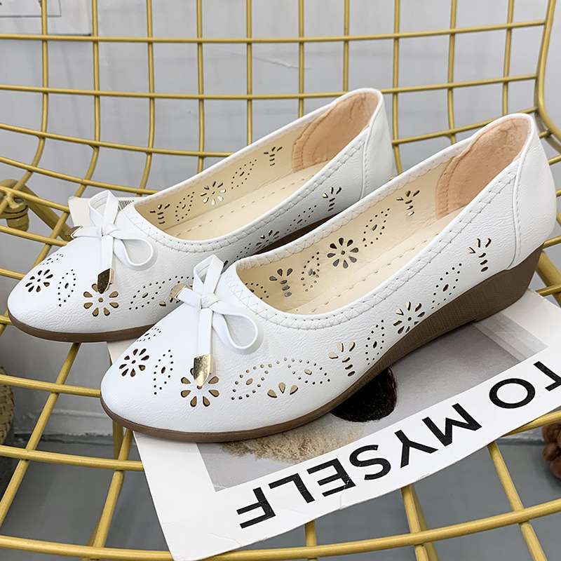 牛筋底 2025 新しい通気性フラワービーンシューズウェッジヒールリボンラウンドトゥシングルシューズママシューズナース女性の靴