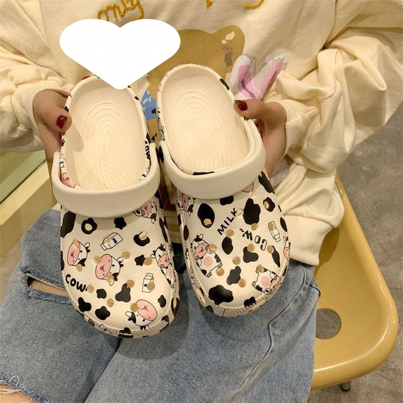女の子のハートが入った下駄、かわいい漫画の牛、ホームソフトソール、厚底アウターウェアサンダル、女性用夏用
