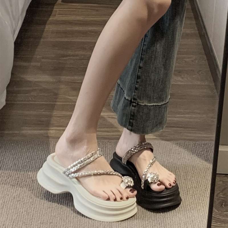夏のアウターウェア用の厚底の女性用スリッパ、2025年の新しいファッション、多用途のラインストーンのつま先サンダル