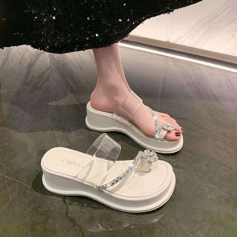 女性の厚底スリッパ 2025 新しいアウターウェアファッショナブルで多用途なクリスタルヒール怠惰なビーチサンダル夏のハイヒールサンダル