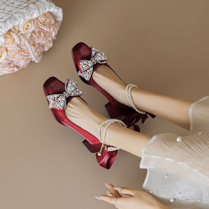 レッド Xiuhe ウェディングシューズスティレットポインテッドトゥハイヒール女性のための 2025 新しいスタイルのリボンパール疲れないブライダルシューズ