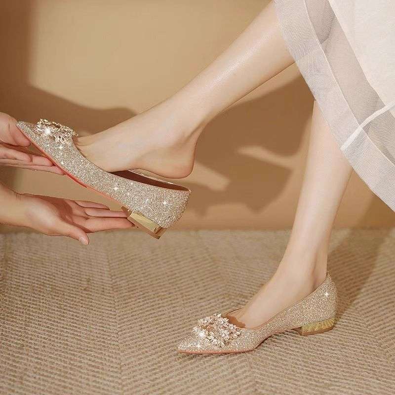 女性用フラットウェディングシューズ 2025 新しいマタニティウェディングシューズ女性のブライダルシューズクリスタルシューズブライドメイドシューズローヒール毎日着用可能