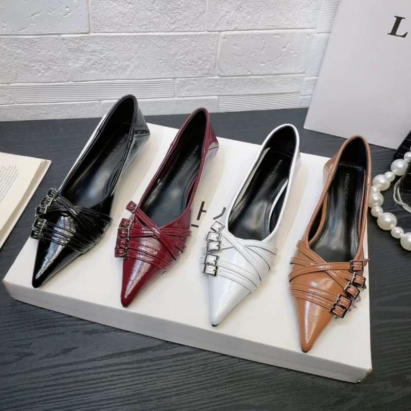 2025年夏ヨーロッパとアメリカンスタイルのポインテッドトゥ浅い口バックル薄いストラップキャットヒールシューズフェミニンな浅い口のローヒール婦人靴