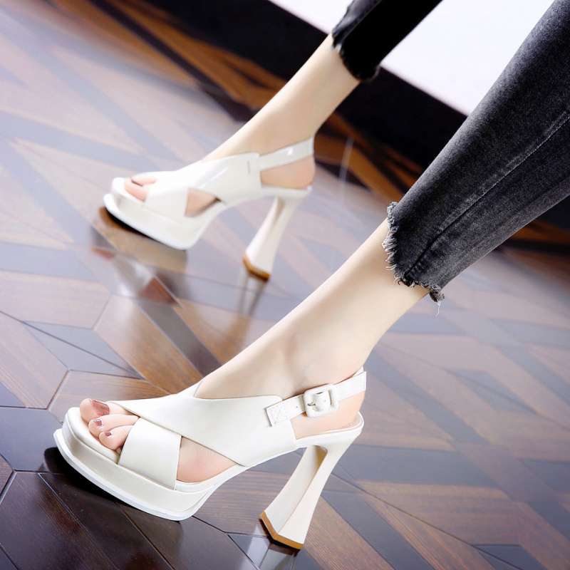 ヨーロッパとアメリカンスタイルのパテントレザーバックストラップオープントゥサンダル女性用 2025 夏の新しいプロフェッショナル防水プラットフォーム厚いヒールハイヒール