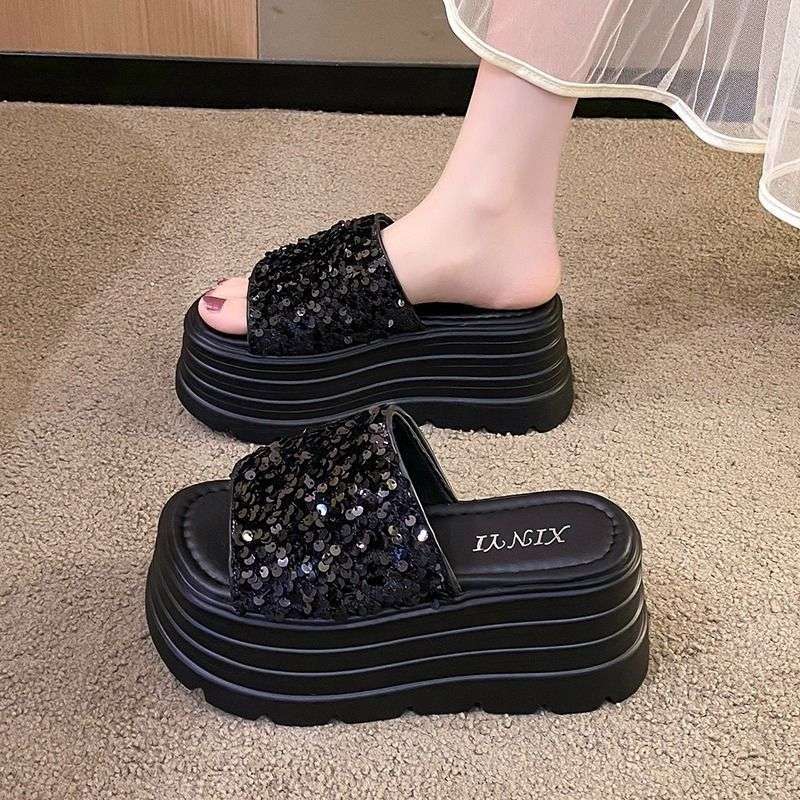 厚底スパンコールファッションドーパミンスリッパ女性の夏の新しいソフトソール 2025 小さな人高さを伸ばす西洋スタイルサンダル