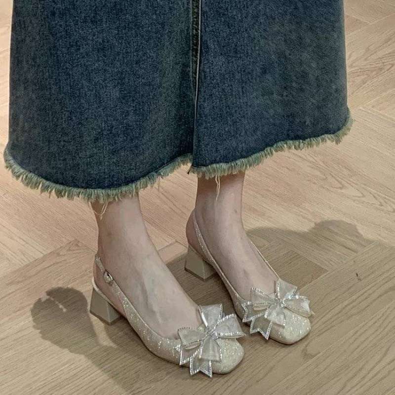 フレンチラインストーンスパンコールクリスタルシューズ小さなスクエアトゥメリージェーントゥサンダル女性の多用途厚いヒール夏用シングルシューズ