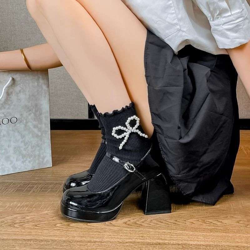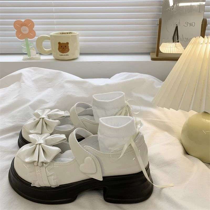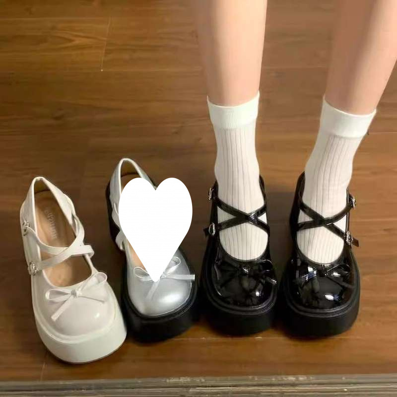 蝶結び太ヒール厚底レザーシューズ女性用 2025 新作夏 JK 英国風プラットフォーム浅口メリージェーンシューズ