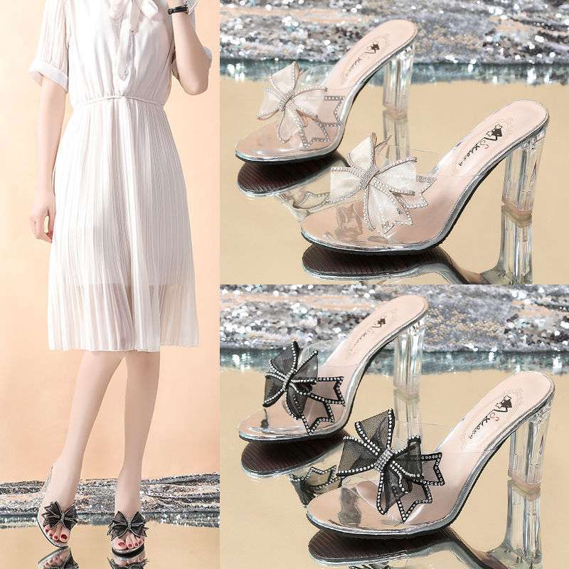 クリスタルハイヒールの女性の新しいスタイルのラインストーンレースリボン韓国スタイルの多用途オープントゥ透明スリッパ夏