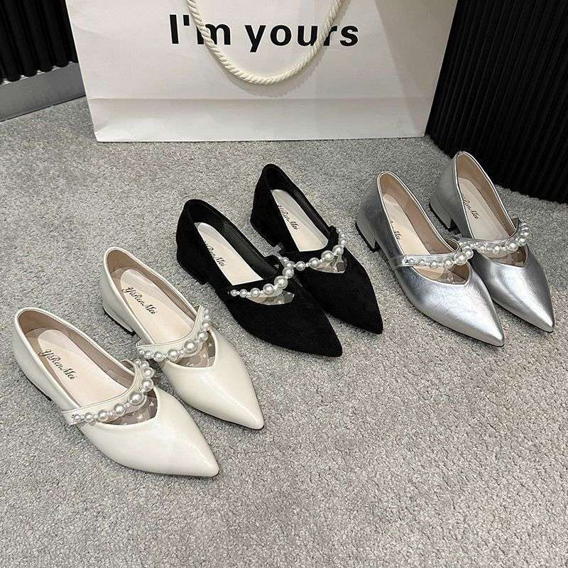 スクエアヒールポインテッドトゥメリージェーンシューズ婦人靴2025春夏新作浅口フレンチパールワンストラップ気質靴