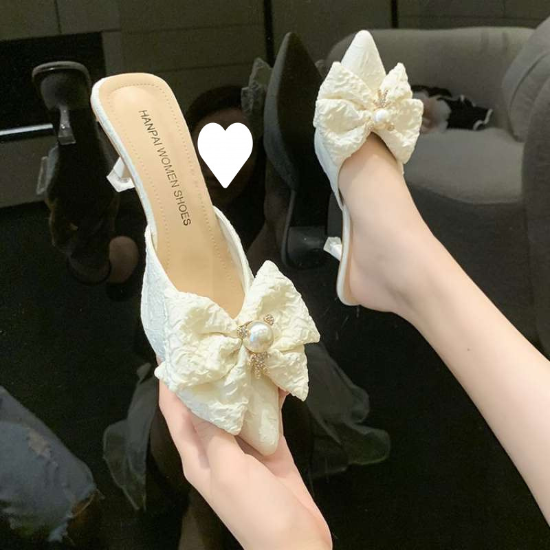女性らしくて万能な細ヒールポインテッドトゥハーフスリッパ、夏のアウトドアウェアに最適な新しいファッションパールリボンミュールハイヒールサンダル