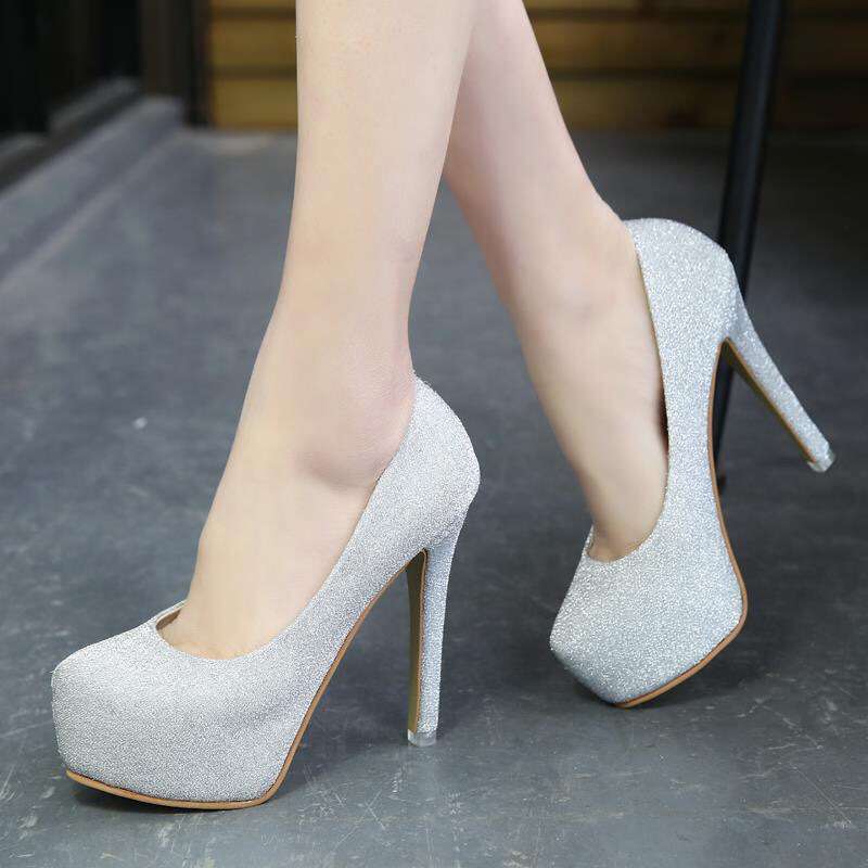 女性の靴春と秋の韓国スタイルの超ハイヒール薄型ヒールラウンドトゥシルバーハイヒールセクシーな女性の防水プラットフォーム靴 12 センチメートル