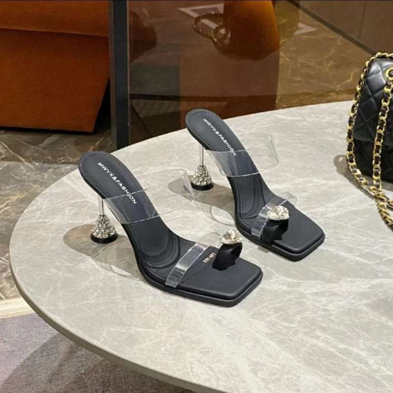 ヨーロッパステーションハイヒールスリッパ 2025 新しい夏の美しい妖精ラインストーンスクエアトゥメタルスティレットヒールサンダル