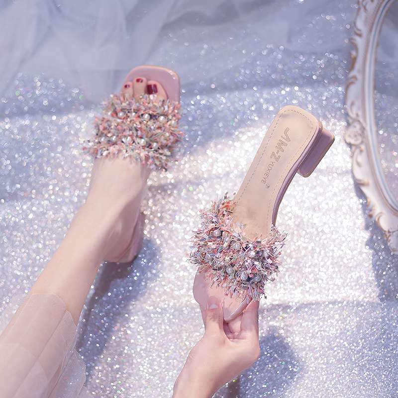 女性用アウトドアスリッパ、夏用スパンコールハイヒール、厚底、ミディアムヒール、ソフトレザー、ラインストーンクリスタルサンダル、アウトドアハーフスリッパ