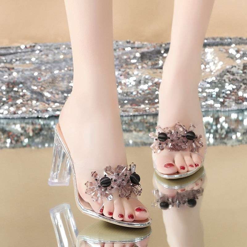 2025年夏の新作、女性用透明ハイヒールサンダル、アウターウェア用太ヒールクリスタルサンダル