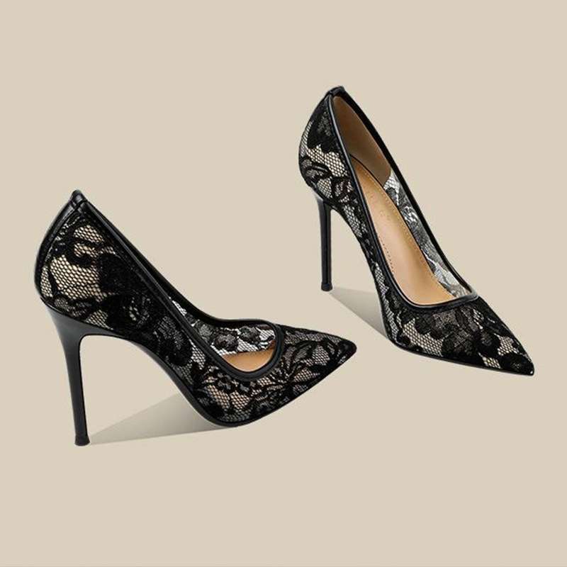 女性のためのメッシュハイヒール 2025 新しい夏ニッチ社交家気質黒レーススティレットヒールポインテッドトゥシューズ女性のための