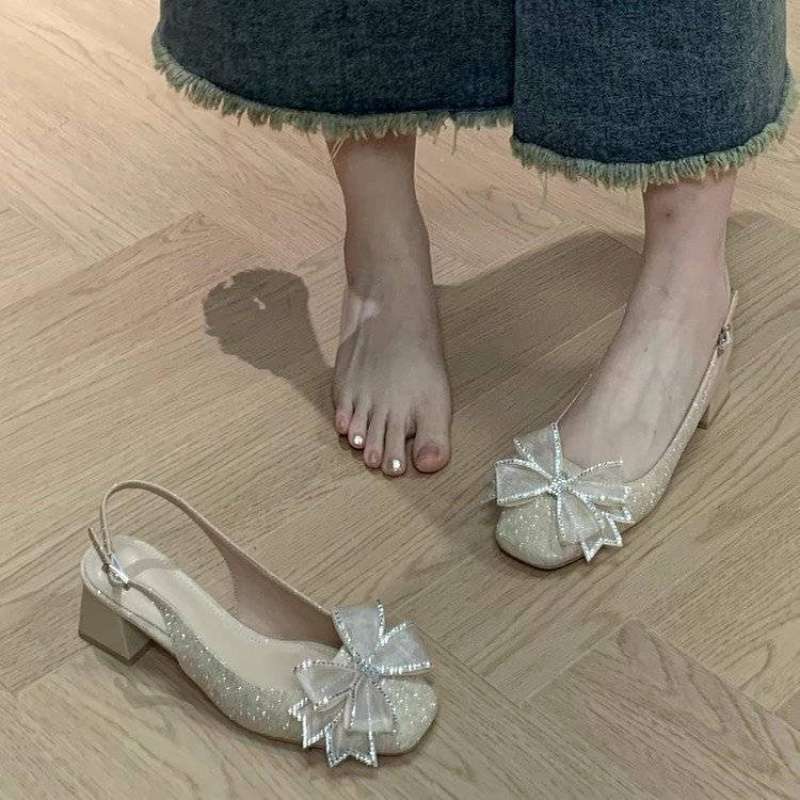 2025 春の新スタイルフレンチセクシーな厚いヒールハイヒールラインストーンスクエアトゥイブニングスタイルバックオープントゥサンダル女性用