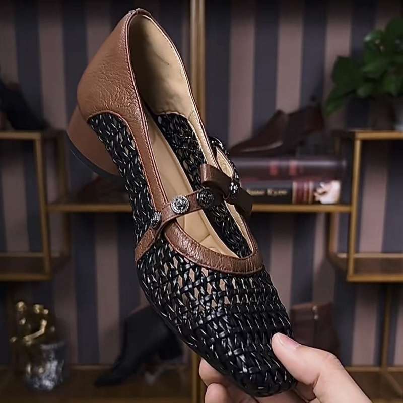 春夏の女性用フレンチ中空織り太ヒールシューズ、エレガントなスクエアトゥ、快適でスタイリッシュなワンラインバックルレディースシューズ
