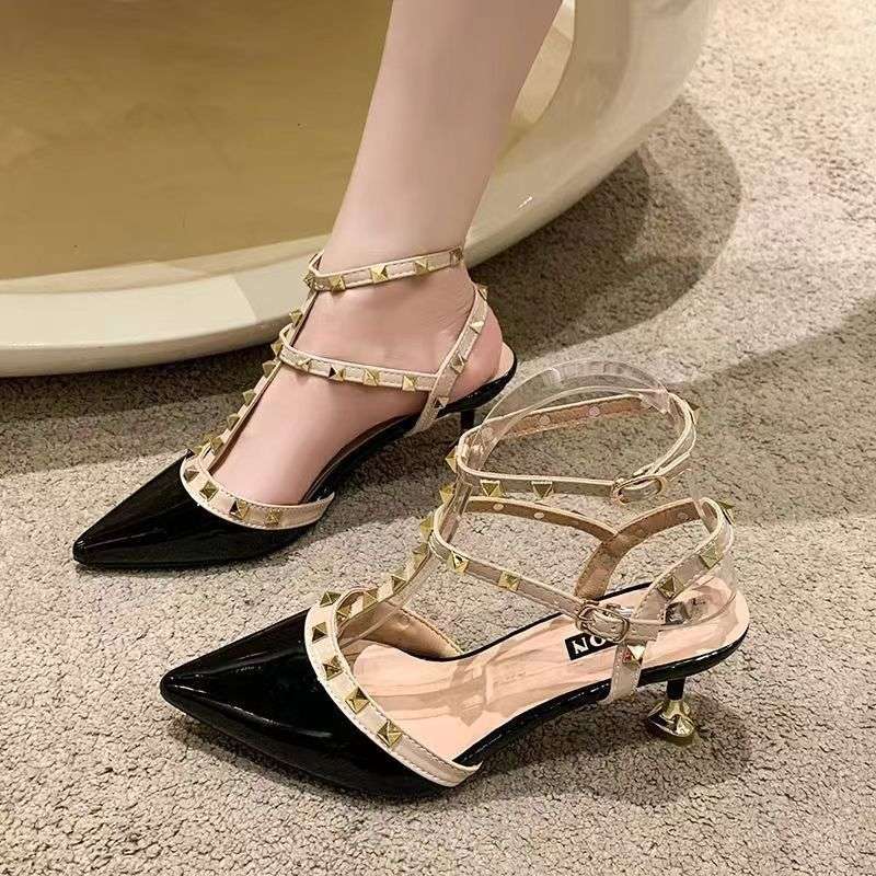 2025 夏包頭ワンラインバックル薄型ヒールポインテッドトゥハイヒールファッションシューズ多用途バックリベットサンダル女性用