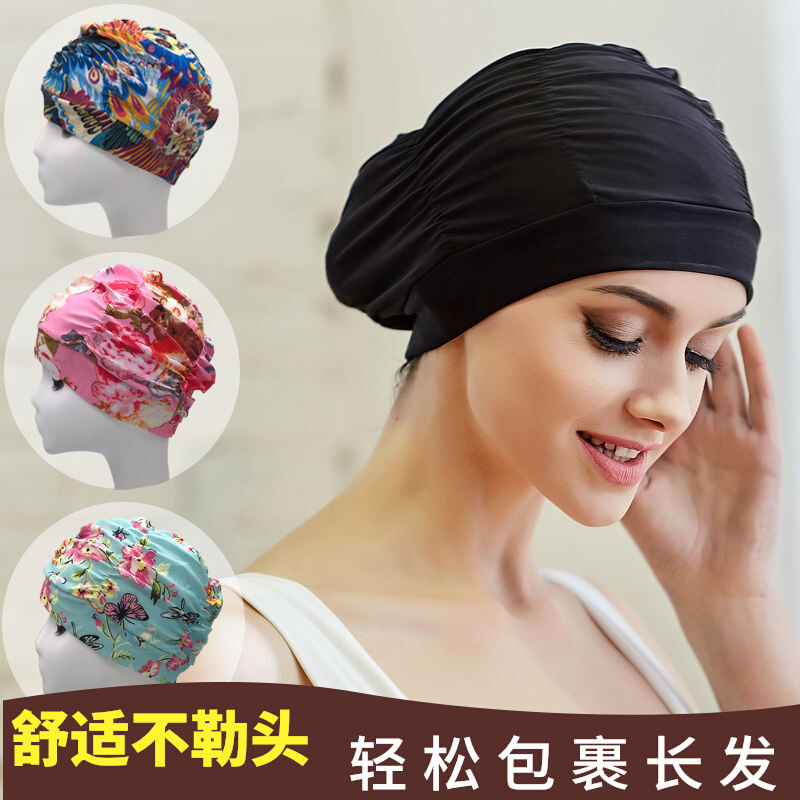 女性用プリーツ布スイミングキャップ、大人用プラスサイズロングヘアスイミングキャップ、頭を締め付けない、おしゃれなビッグヘッド温泉キャップ