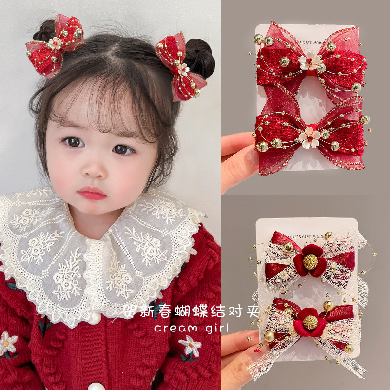 2024新作の赤い蝶結びの毛玉の子供のヘアピン新年の髪飾りの髪飾りの女の子の赤ちゃんのクリップのバッチ