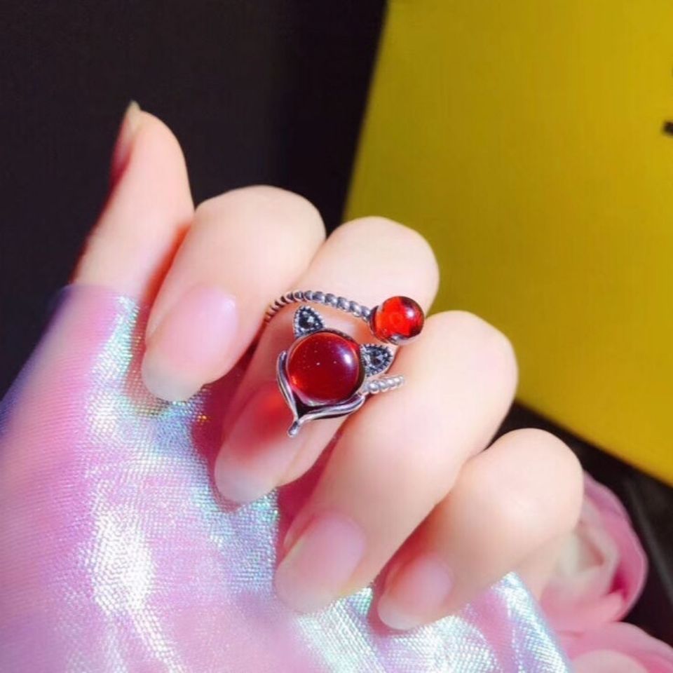 狐戒レトロ銀指輪活口ガーネット銀指輪女性ファッション指輪個性ファッション