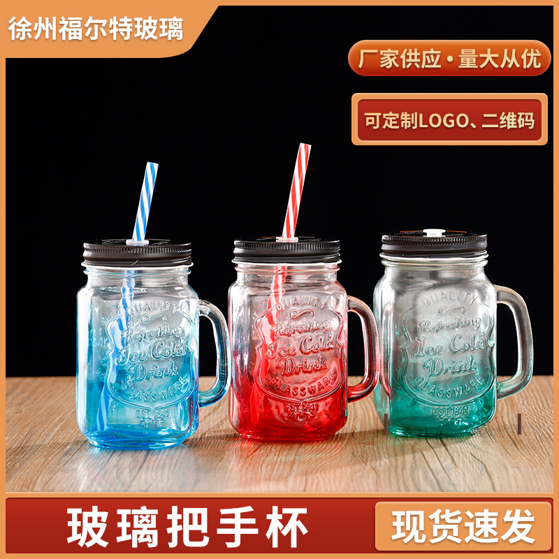 メーカー卸売り取っ手グラス蓋付きカラーガラスコップ広告プレゼントグラスグラデーション色メイソンカップ