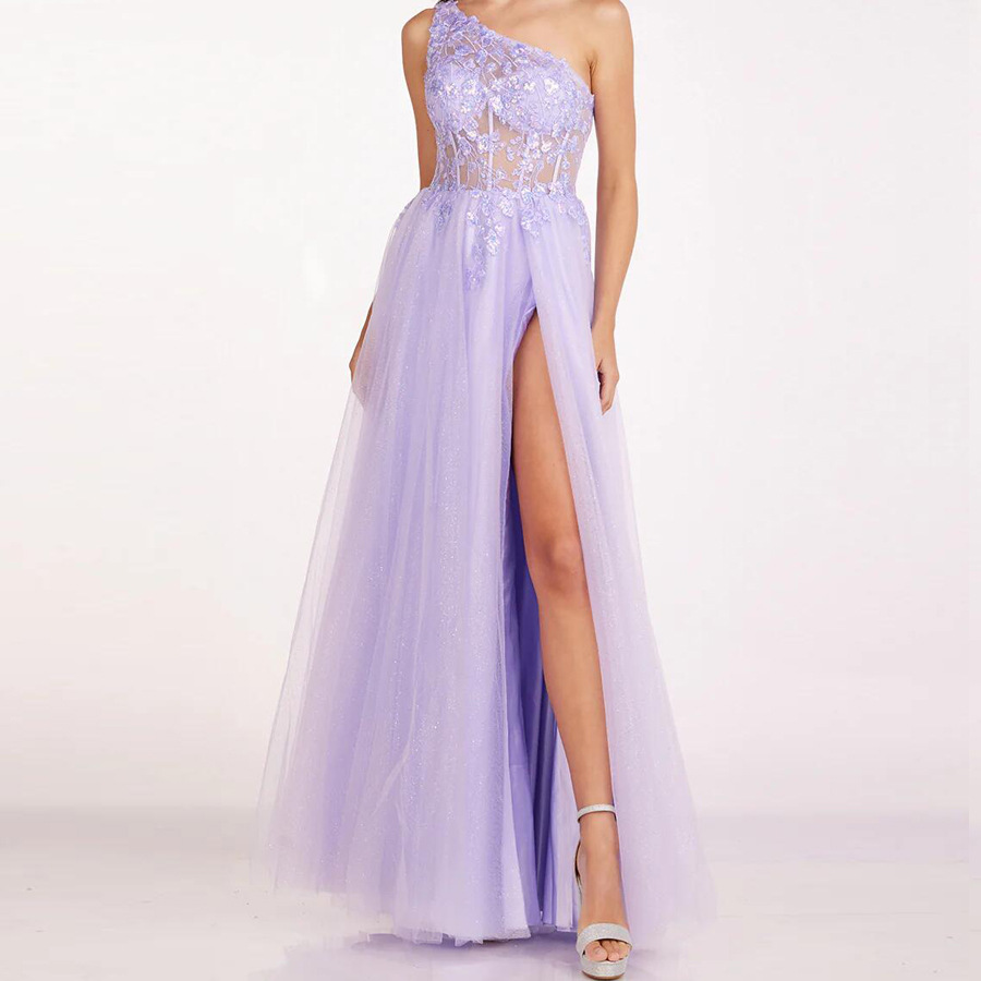 アマゾンの新しい女性のスパンコールレースの舞踏会のドレスA字のシングル肩のオープンフォークのスリムなドレス