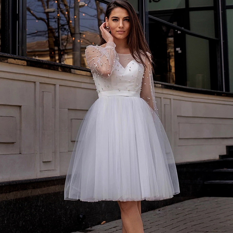 アマゾンの外国貿易の短いウェディングドレスの女性2021新型の長袖の結婚の真珠のサスペンダーのサテンの軽いウェディングドレスの年会のドレス