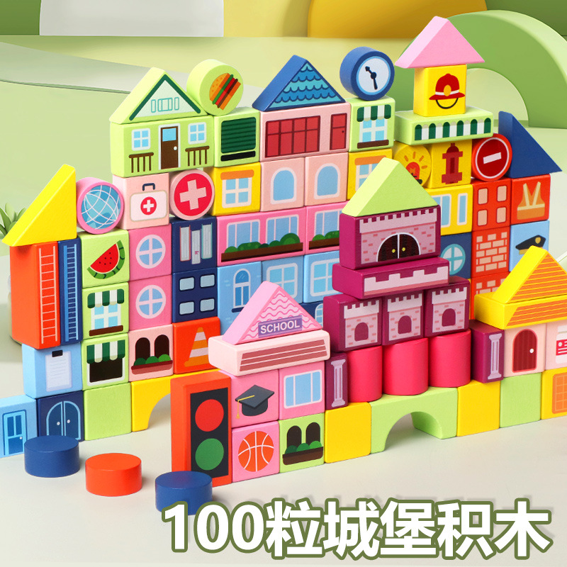 子供の木の質の積み木の都市の街並みの多彩な人物の動物の車の大きい粒子の積み木の桶はおもちゃを詰めます。