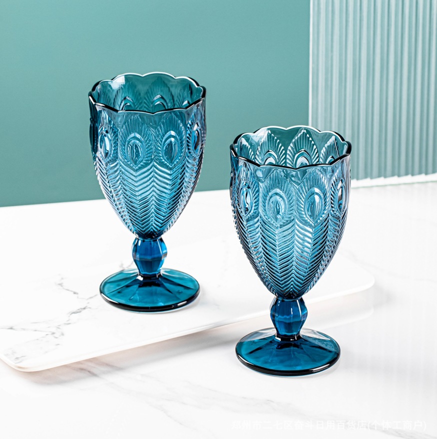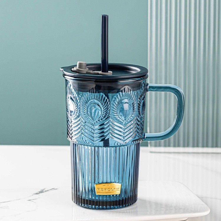 Leweishi モノクローブルーピーコックフェザーストローカップレトロ縦柄オフィスガラスハンドル付きストローカップ INS スタイル