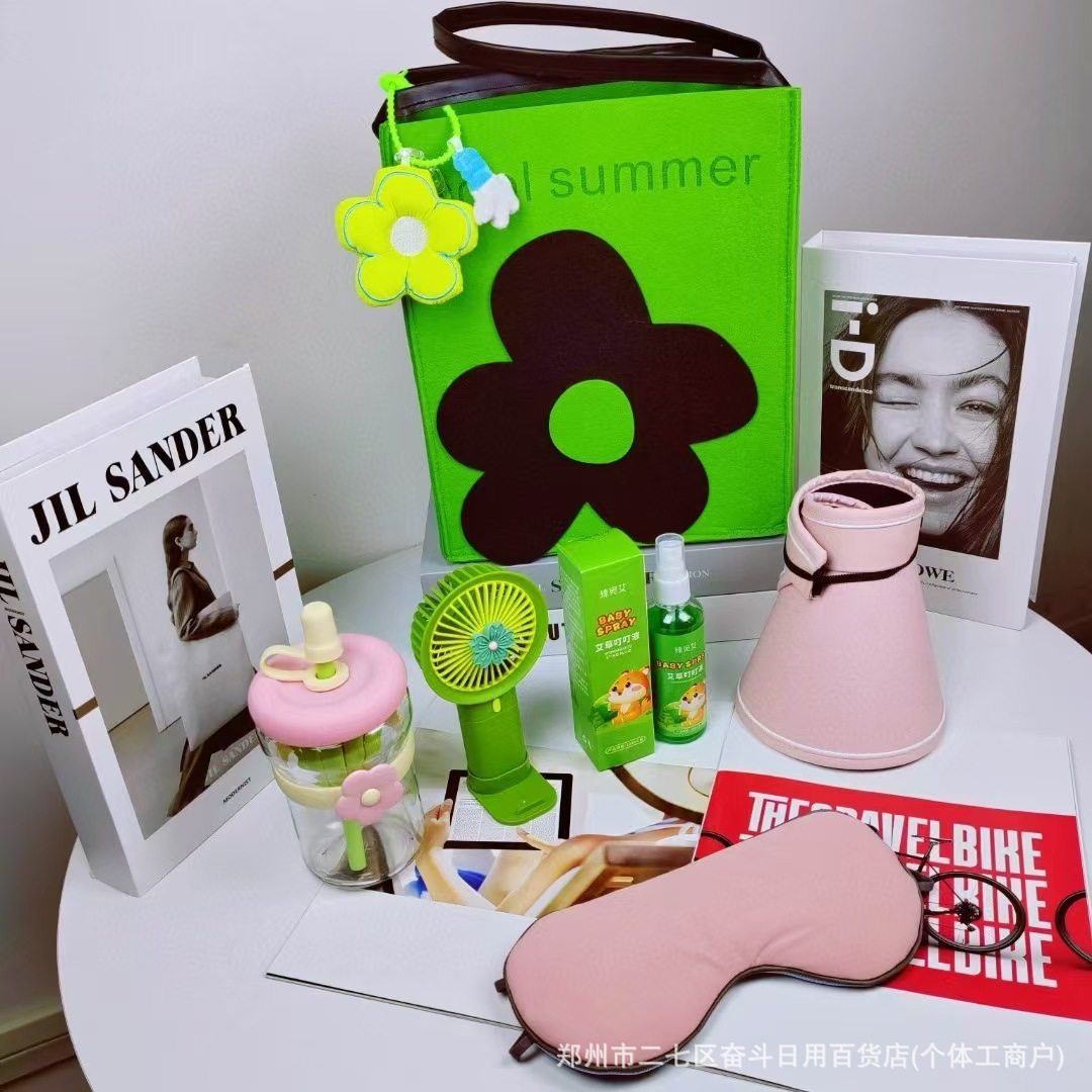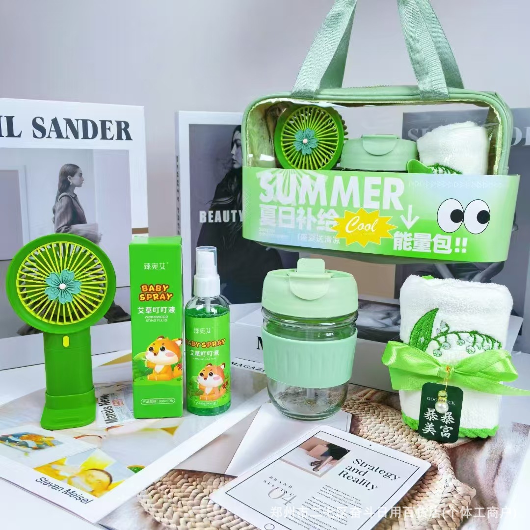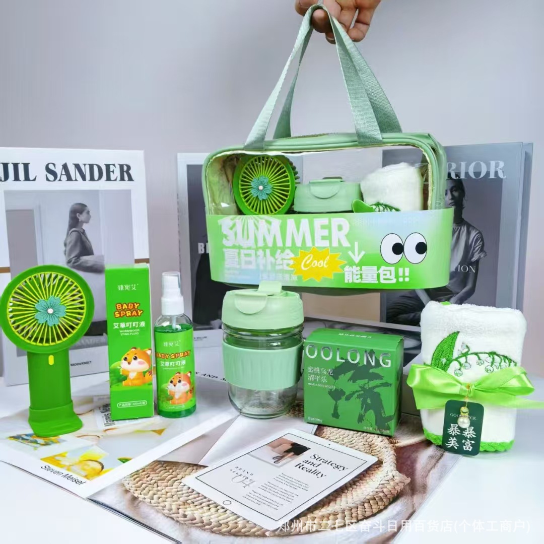 夏のエネルギーパック、お土産、携帯用小型扇風機、化粧品袋、液体タオル、ダブルドリンクカップ