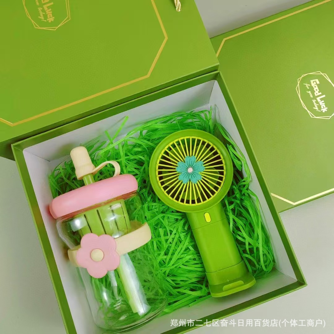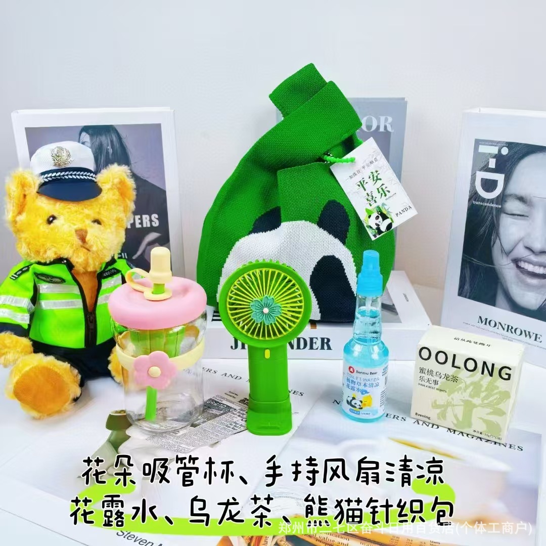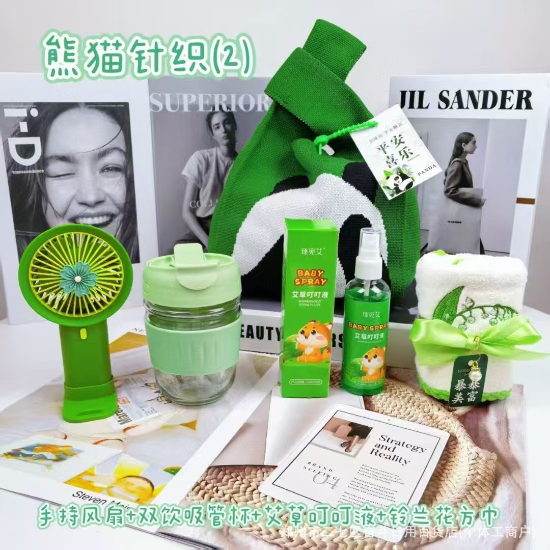 パンダニットバッグお土産手持ち小型扇風機ガラスダブルドリンクカップヨモギ液桃ウーロン茶セット