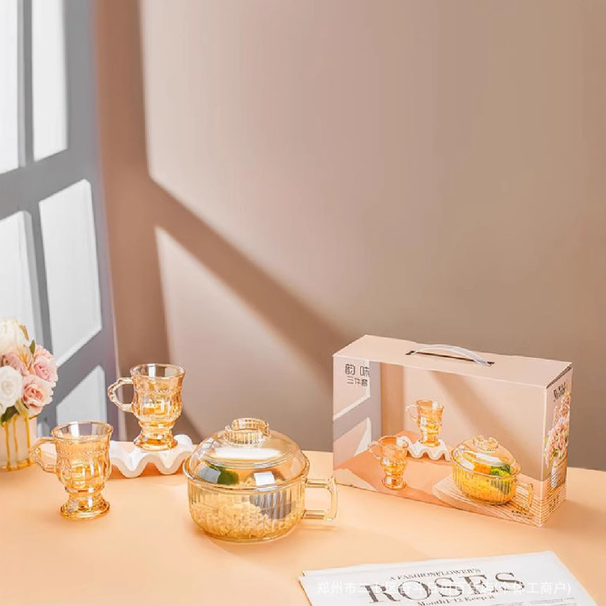 ギフト 3点セット ガラス製インスタントラーメンボウル 蓋付き ディナーカップ ライスボウル アンバー 会社銀行 保険祭