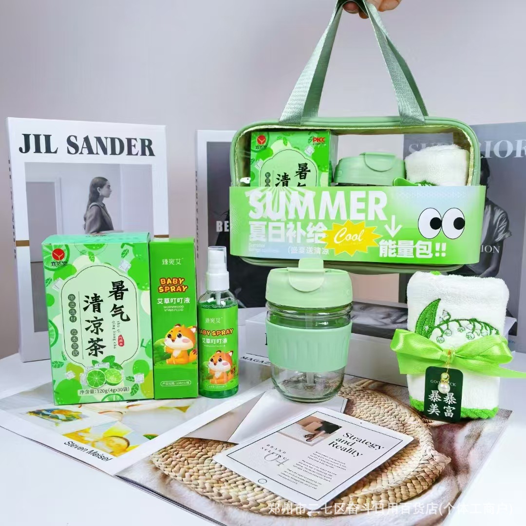 夏のエナジーパック、お土産用化粧品袋、手持ち小型扇風機、よもぎ液、ガラスカップ、タオル、香り茶