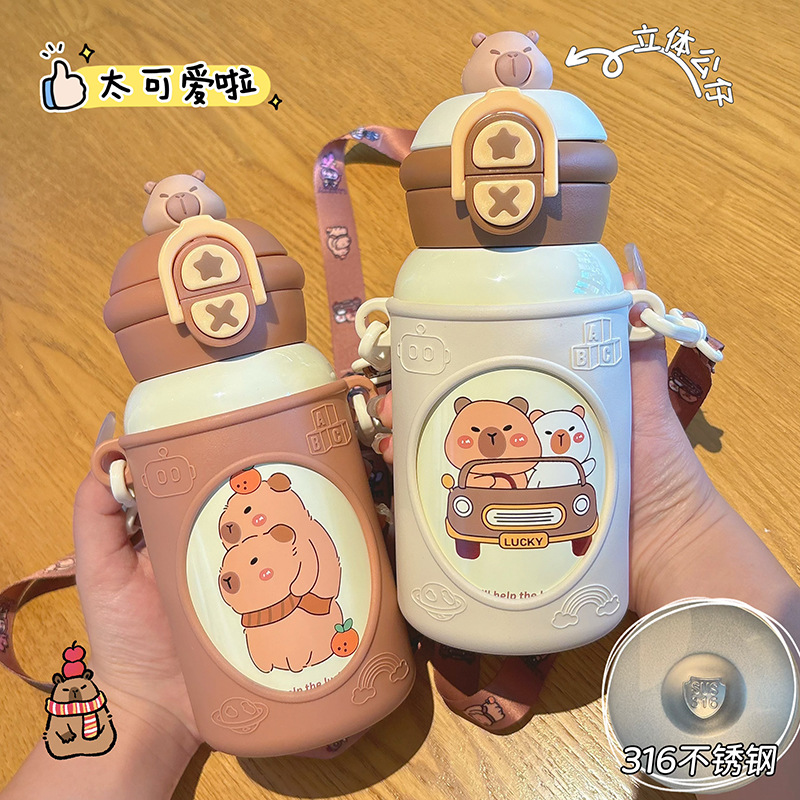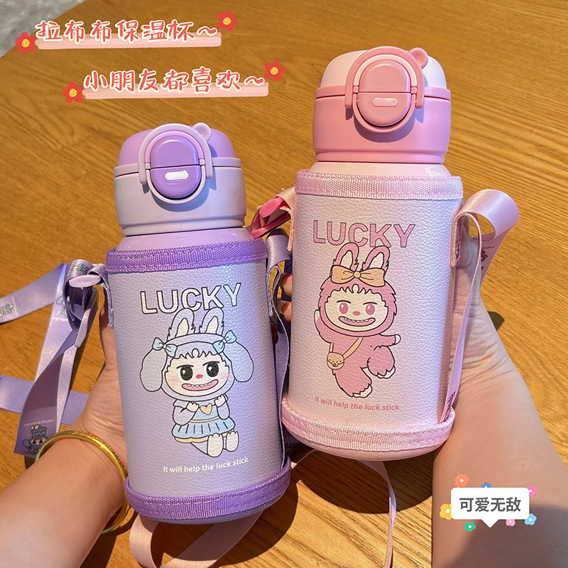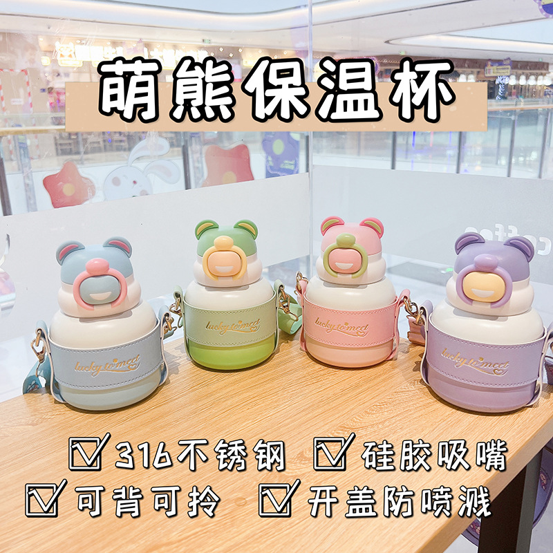 卡通儿童保温杯316不锈钢吸管杯便携背带高颜值萌趣公仔双饮水杯
