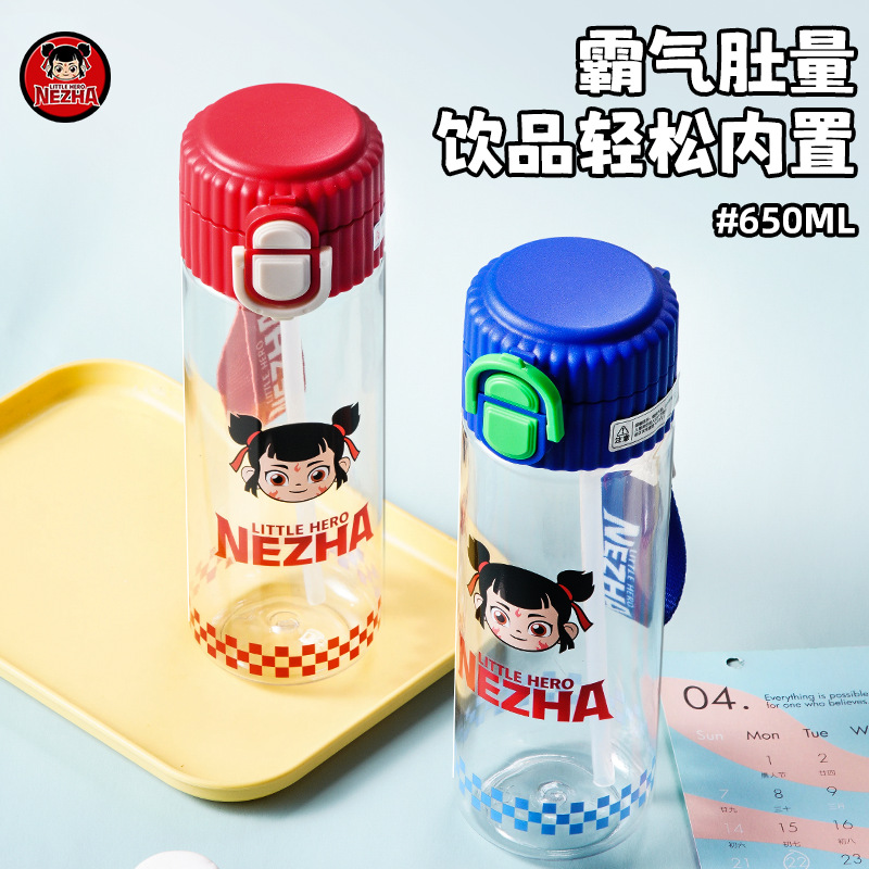 夏の必需品 Nezha プラスチックカップ大容量子供用ウォーターカップ、持ち運び可能な二重飲み口付き多目的漫画ケトル