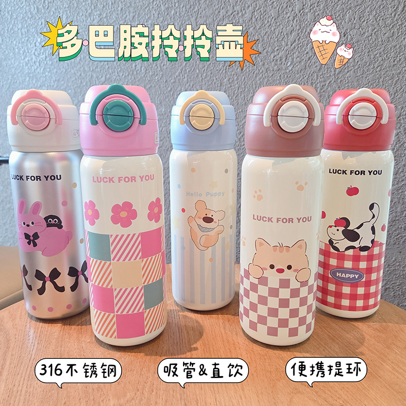 ドーパミンカラーマッチングカップ 316 ステンレス鋼子供用魔法瓶ケトルは吸引可能で、ストレートダブルドリンクカップポータブルストローカップ