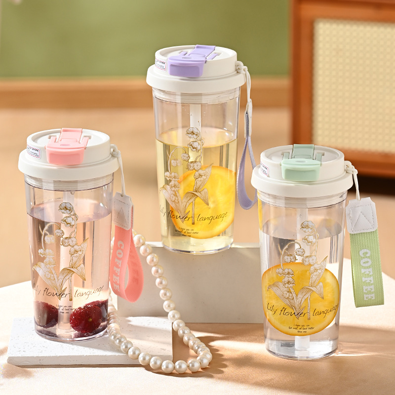 2024新型スズランプラスチックコーヒーカップは、ロープ付きの携帯型大容量の高颜値学生用のダブルカップを持っています