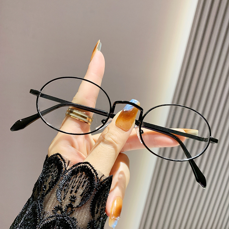 韓国版の純粋な欲望スタイルの楕円形ハーフフレーム金属製抗青色光フラットミラー、四角顔と丸顔の女性向け、高級感があり、近視メガネと組み合わせることができます。