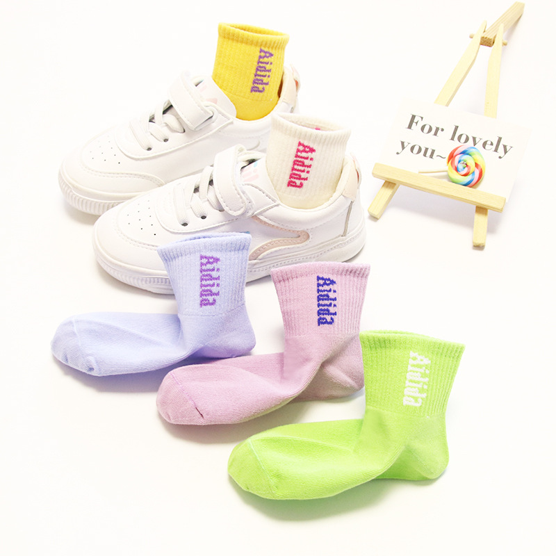 卸売りの新しい子供の靴下のアルファベットの春の女の子の潮ins運動のキャンディーの色の1-15歳の学生の赤ちゃんの靴下
