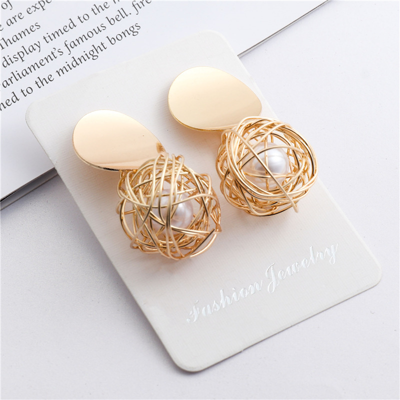 欧米のクロスボーダーの透かし彫りの幾何学の耳飾りは丸いボールの真珠の鳥の巣の個性のイヤリングの気質を編んで誇張します金属のイヤリング