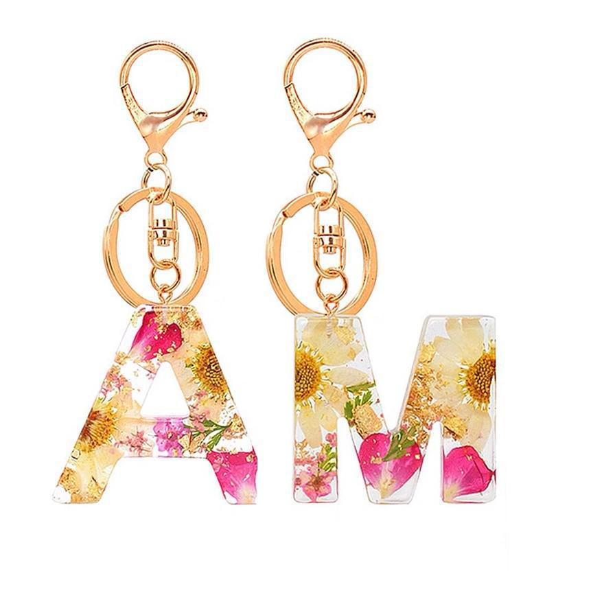 樹脂26文字のアルファベットのキーホルダーの頭文字のキーホルダーの花蝶ピンクのキーホルダーの女性の誕生日プレゼント