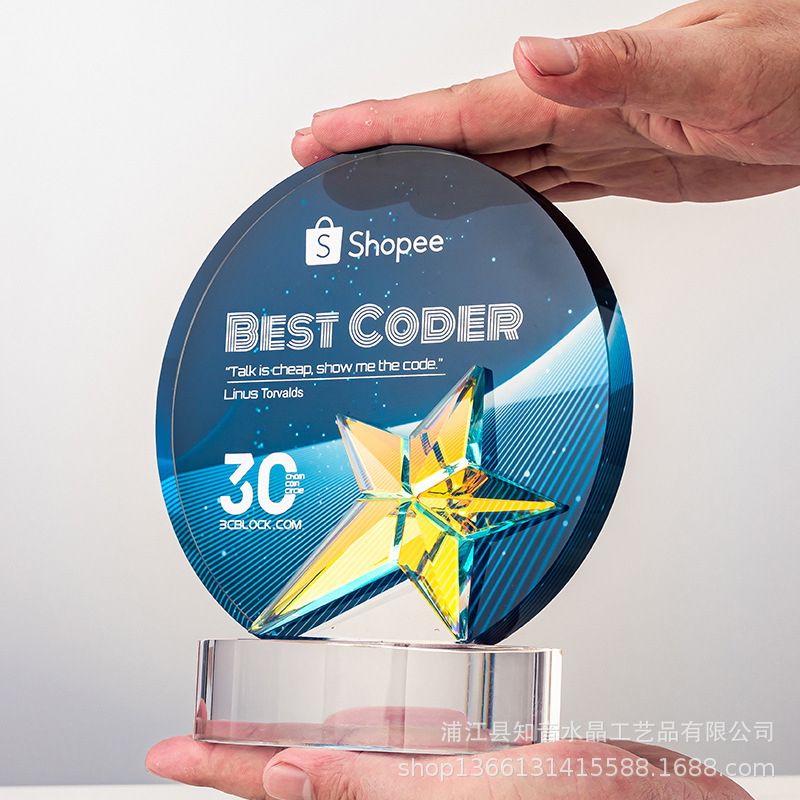 創意水晶トロフィーカラー印刷無料彫刻五角星クラウン金銀銅優秀社員授賞記念卸売り