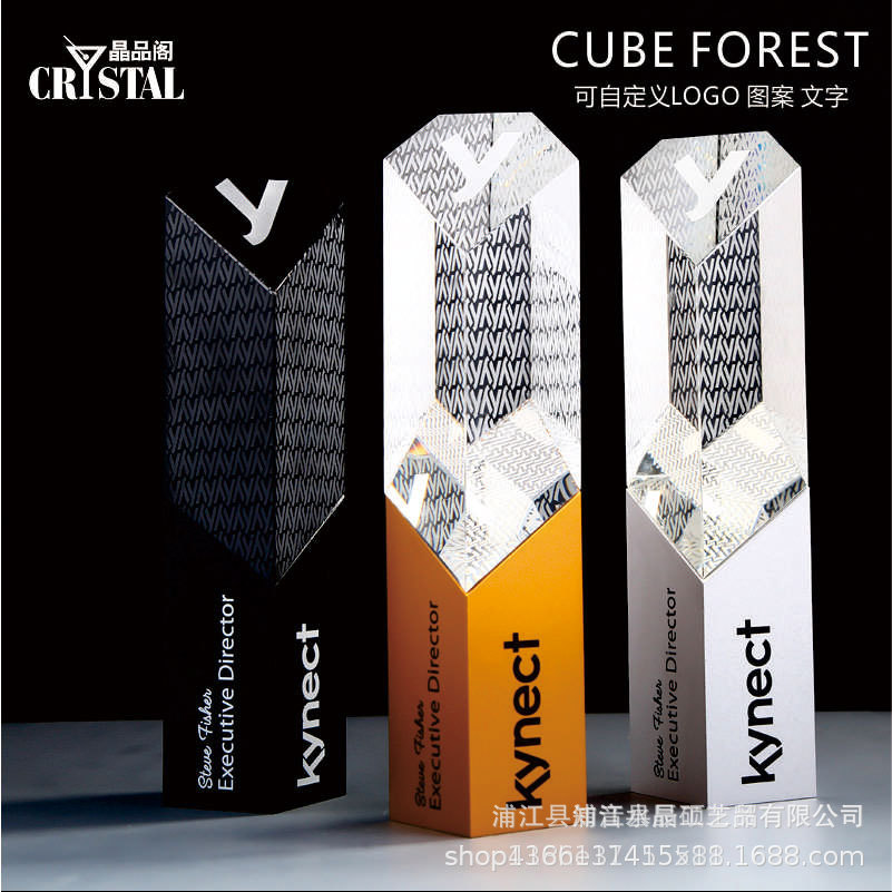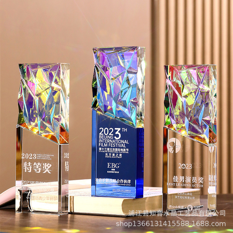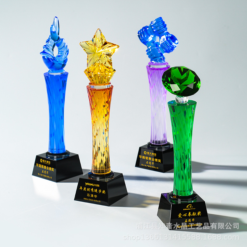 カラフルな水晶のトロフィーをカスタマイズして優秀な従業員のアイデアを販売します。
