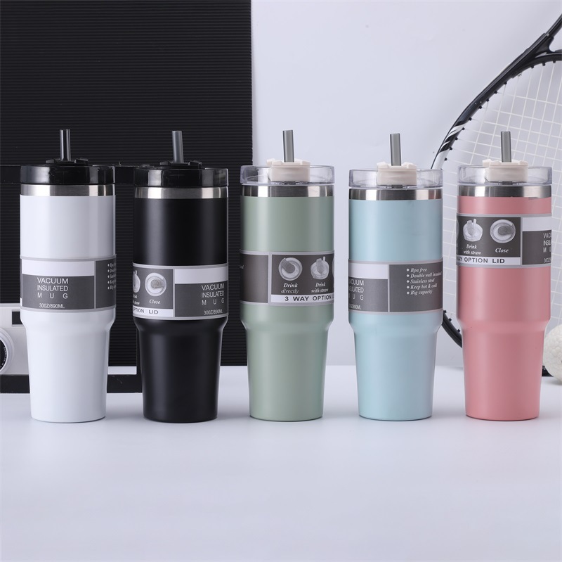 新型国境を越えたストロー付き自動車カップ大容量30オンスステンレス保温保冷氷覇カップ車載コーヒーカップ