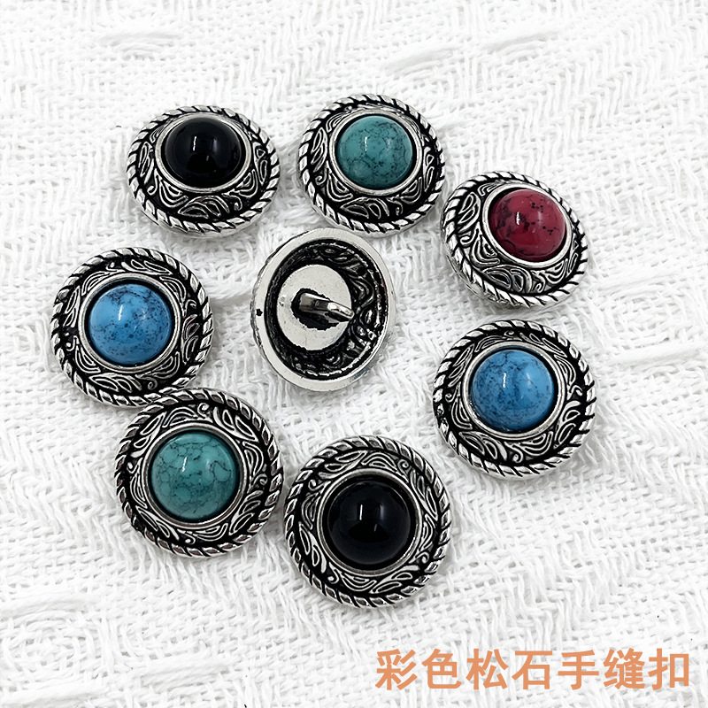 2024新古銀色カラー松石手縫いボタン中国風復古DIY小模様装飾ボタン大衣ボタン