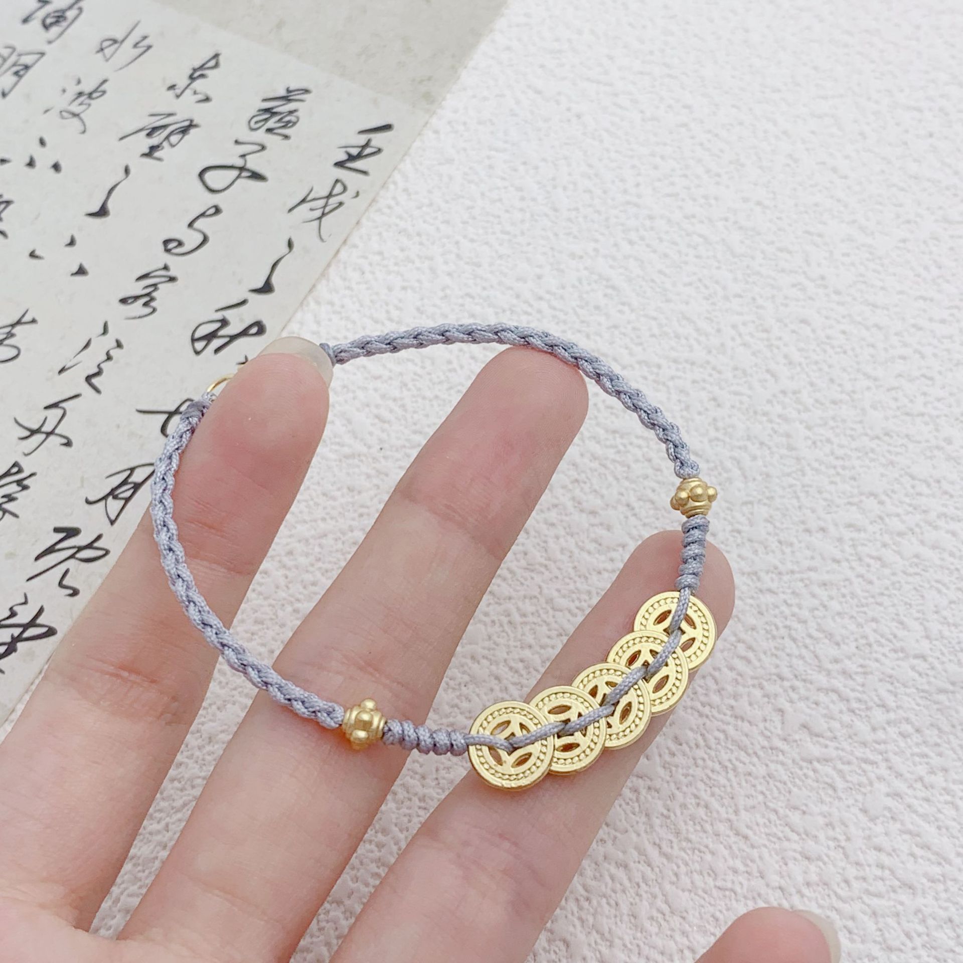 五帝の銅銭のブレスレットの女性は手で赤い縄を編みます。