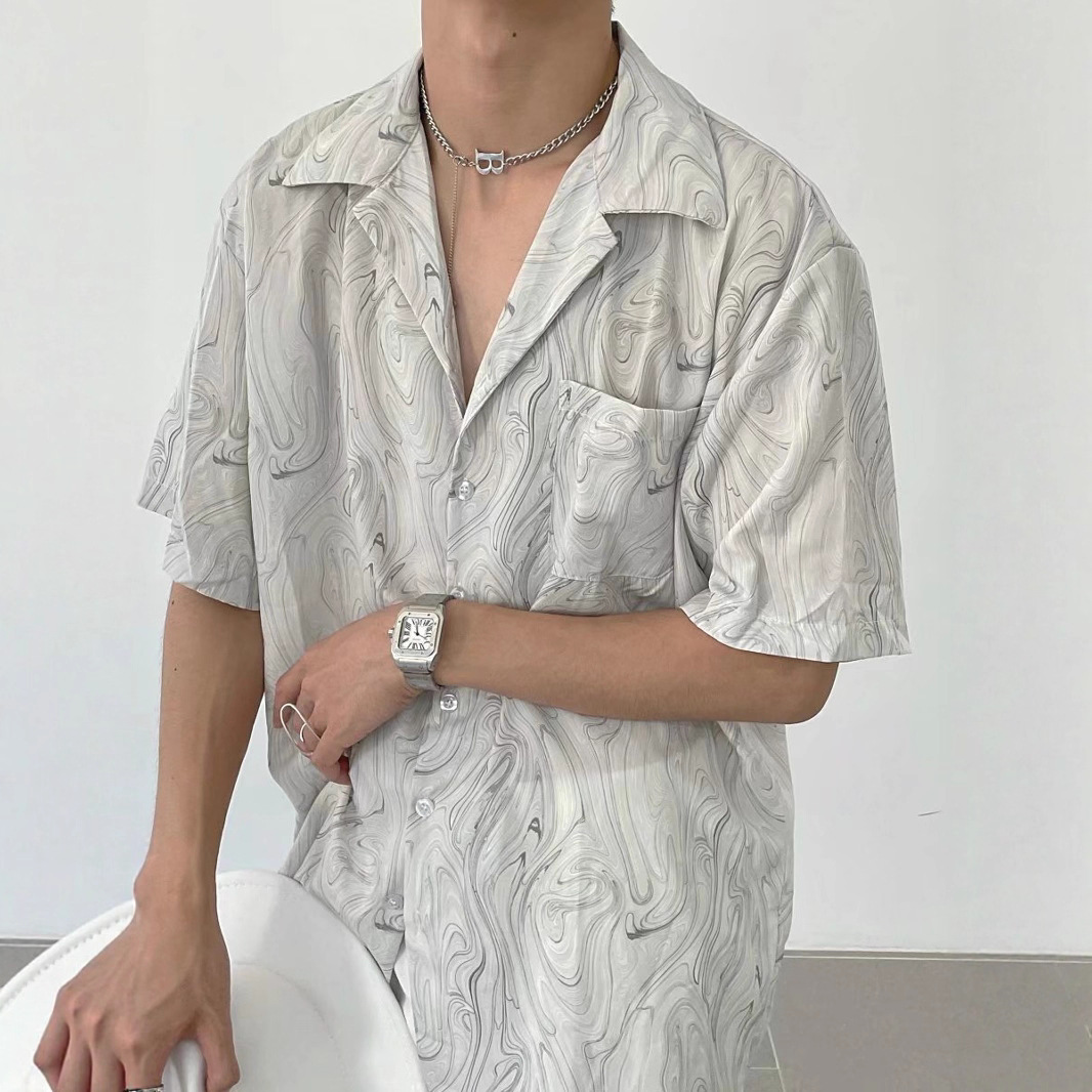 レトロなハイエンド波模様半袖シャツメンズ春夏香港スタイル怠惰なルーズ西洋スタイルカジュアルシャツ