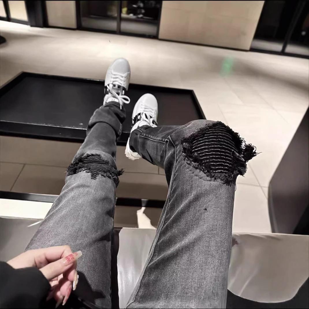 夏の新しいアメリカンハイストリートフォグスタイルのフェイクリップルプリーツジーンズ、男性と女性用、同じスタイルのウォッシュ加工のダメージパンツ